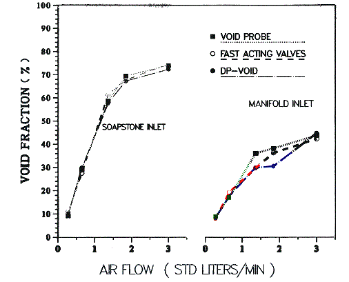 The validation of a new measurement technique requires the existence of a standard. However, it is generally difficult to qualify measurements made with a local void fraction device since no convenient standard exists. The fast-acting valves allow, by measuring the relative lengths of the tripped gas and liquid columns, a direct measurement of the spatially averaged void fraction. A local measurement, such as that from the EFP probe, can be validated against a spatially averaged measurement only for flow conditions in which the vapor volumes are uniformly distributed in the test section. A second way to validate the results of the EFP probe is to compare them with the void fraction calculated from the differential pressure measurement. This comparison, however, can be made only for a limited range of flow conditions (low liquid and air flows) where buoyancy forces are predominant.
